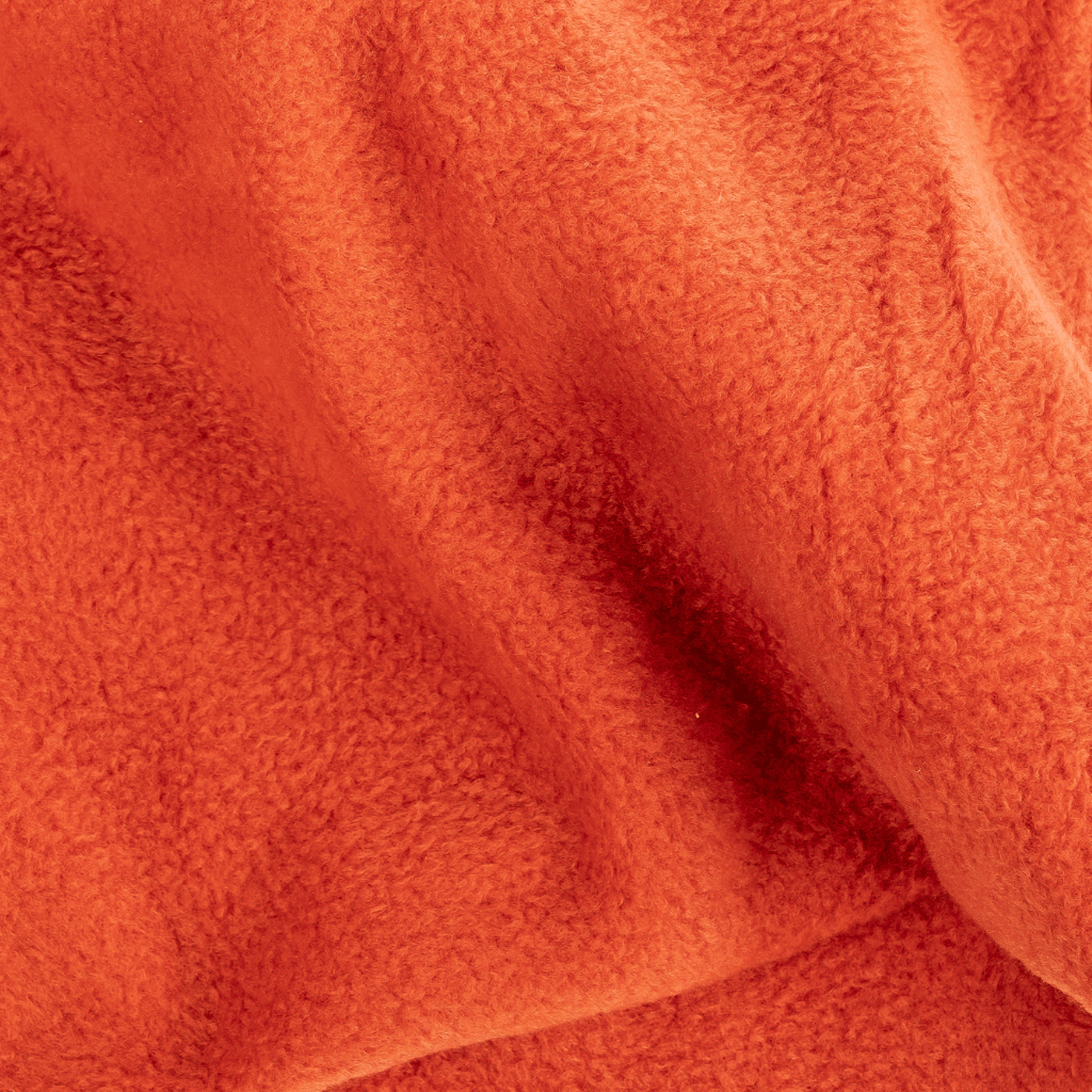 Fleece Neckwarmer - Autumn Nectar, in leuchtendem Orange, getragen von einer Frau mit dunklen Haaren, fotografiert vor hellem Hintergrund.