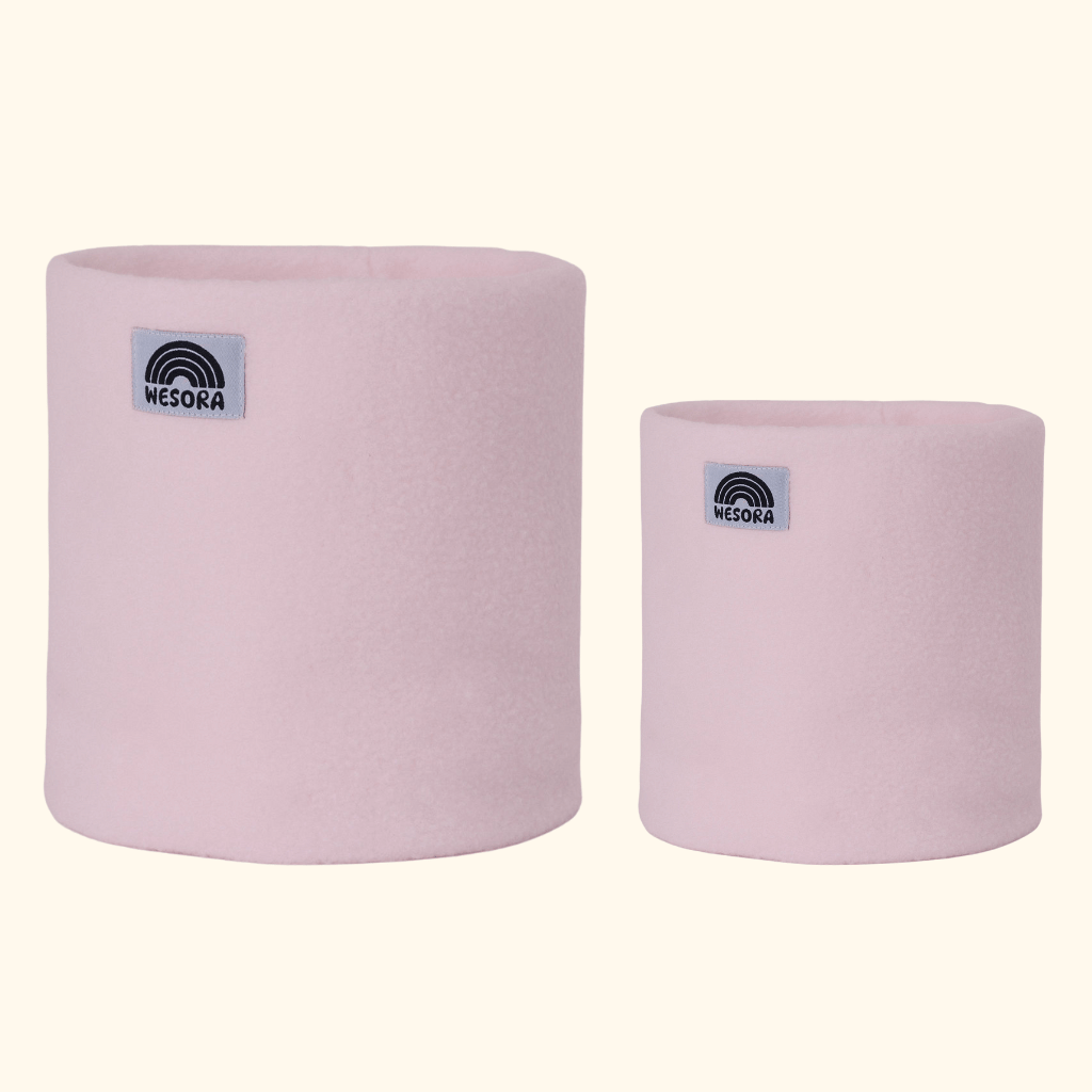 Eltern + Kind Bundle - Fleece Neckwarmer Candy Rose, zwei weiche Halswärmer in verschiedenen Größen mit Wesora-Logo, ideal für gemeinsame Outdoor-Abenteuer.