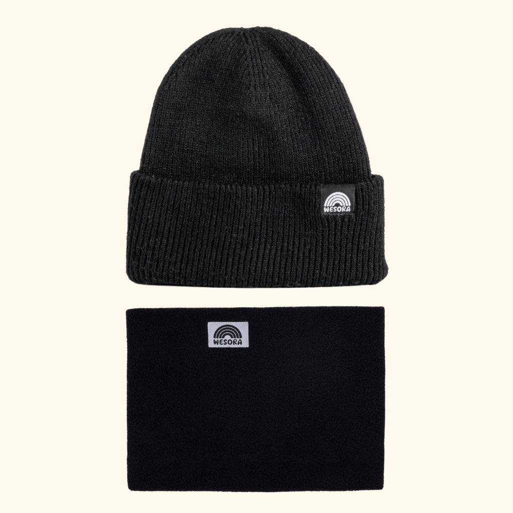 Neckwarmer & Beanie Bundle - Black mit WESORA-Logo, präsentiert als stilvolles, zeitloses Set für kühle Tage.