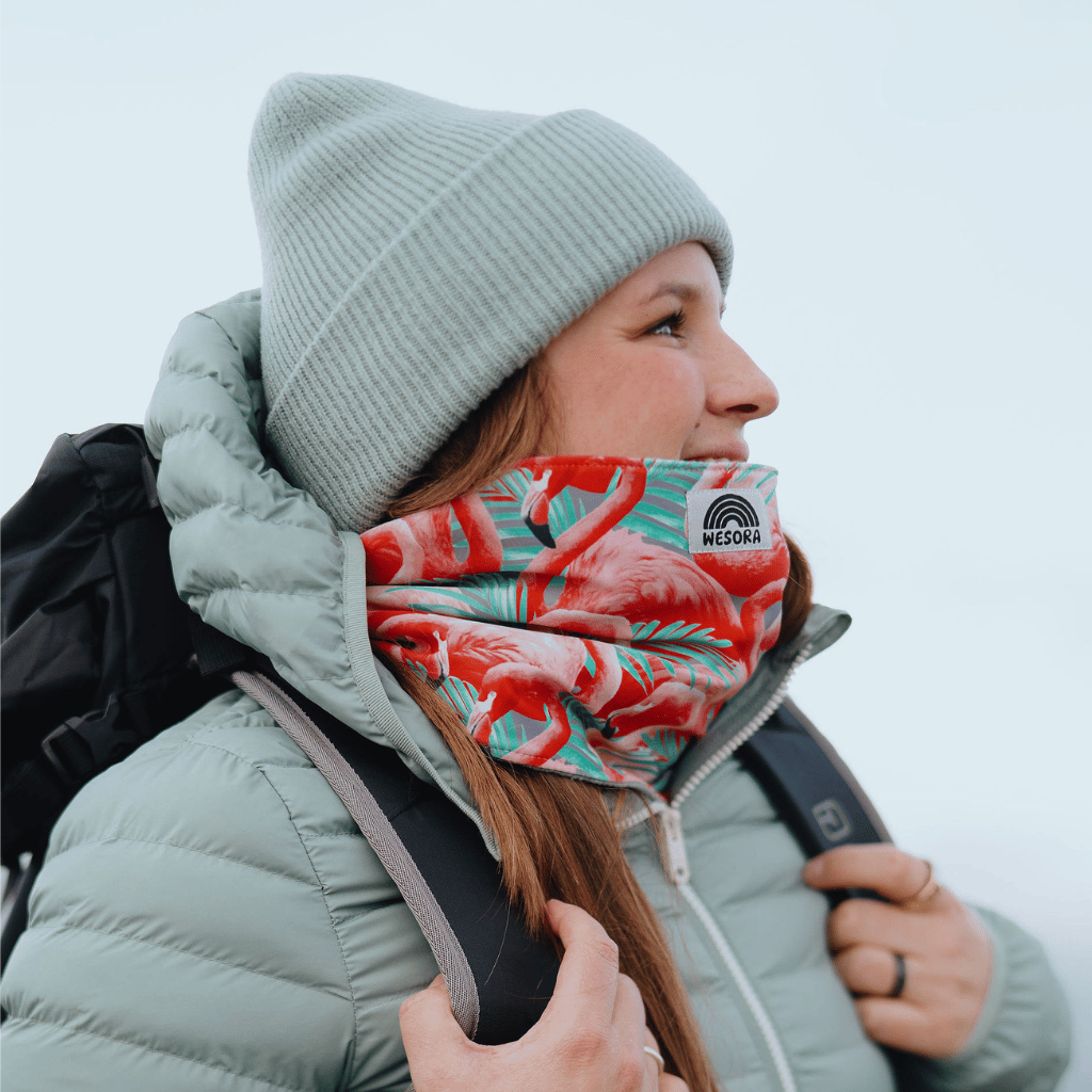 Neckwarmer & Beanie Bundle - Flamingo Green mit Flamingo- und Blattmotiven, getragen bei einer Wanderung, fotografiert in frontaler Ansicht.