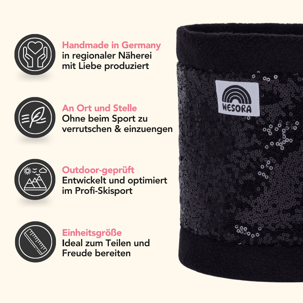 Pailletten Neckwarmer - Sparkle Black aus schwarzem, funkelndem Stoff mit WESORA-Label, handgemacht in Deutschland, ideal für sportliche Aktivitäten.
